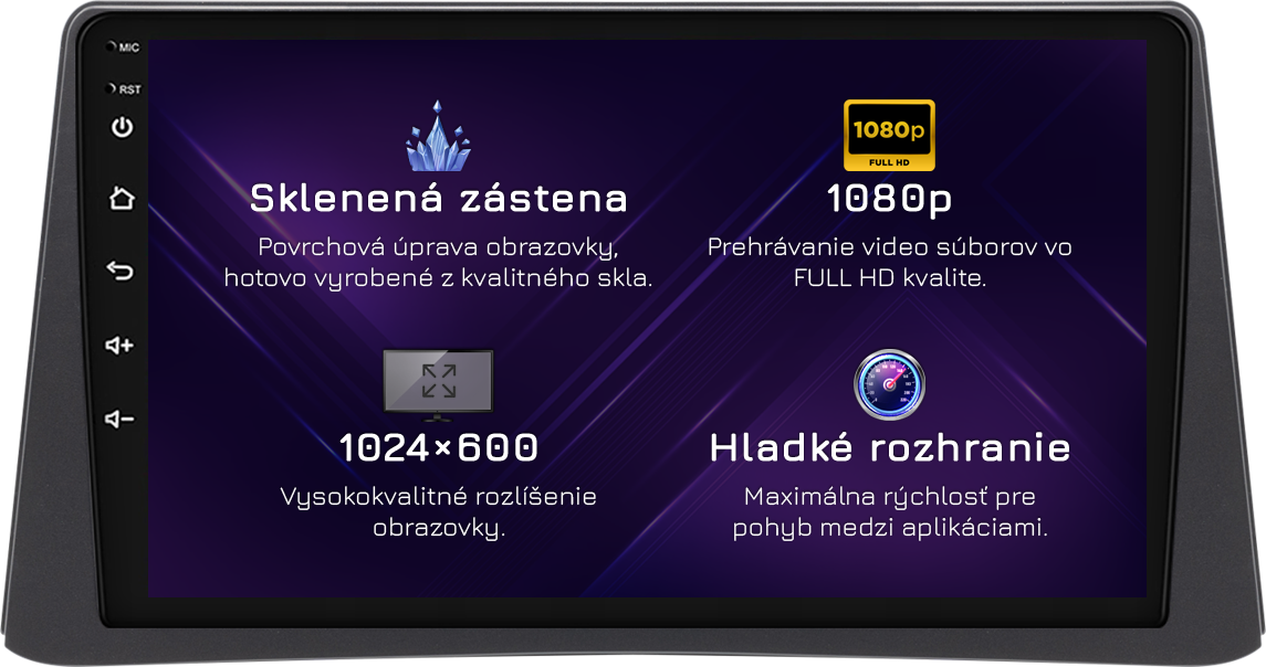 ⚠️ Rozlíšenie: 1024px x 600px = Širokouhlý Super VGA. Najobľúbenejší štandard zobrazenia pre špičkové rádiá. Videá sa prehrávajú v HD kvalite.