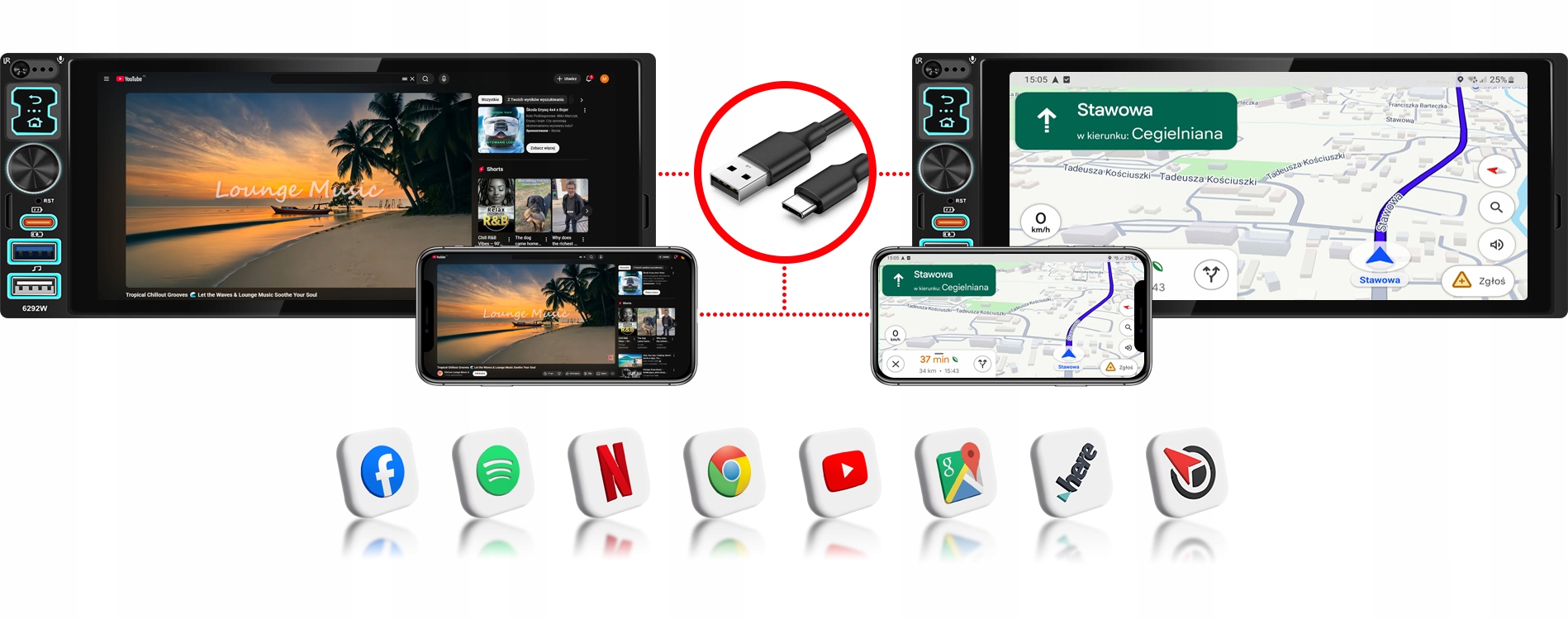 Vďaka až trom USB portom (2× USB a 1× USB-C) môžete súčasne nabíjať dva telefóny a používať USB kľúč. Zároveň sa môžete k rádiu pripojiť aj káblovo a využívať Apple CarPlay alebo Android Auto – telefón sa tak nebude vybíjať tak rýchlo ako pri bezdrôtovom pripojení.
