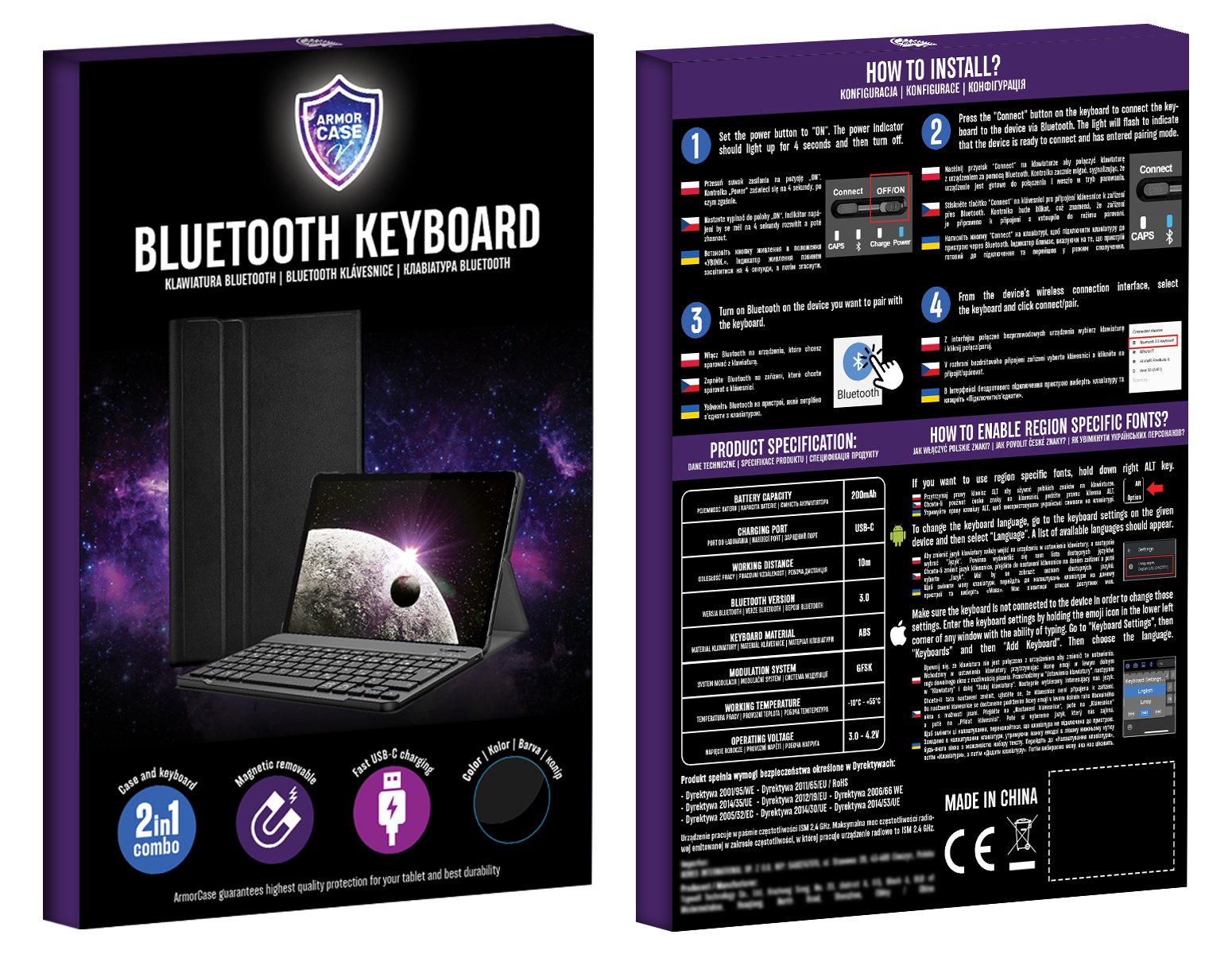 Naša klávesnica ArmorCase je jednou z mála na trhu so zabudovaným, vyhradeným portom USB-C na nabíjanie klávesnice (v súčasnosti najpopulárnejší európsky a svetový štandard). Vďaka tomu môžete na nabíjanie používať akýkoľvek kábel, napríklad nabíjačku telefónu.