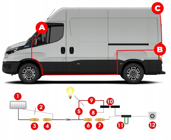 - Červený vodič – spojiť s červeným vodičom č. 9 a následne pripojiť k +12 V svetla spätného chodu.