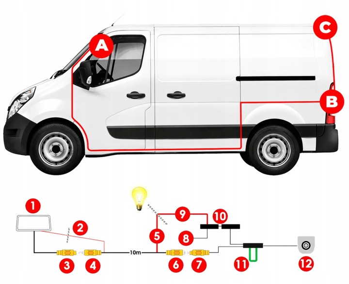 5. Červený vodič spojte s červeným vodičom č. 9 a následne pripojte k +12 V spiatočkového svetla