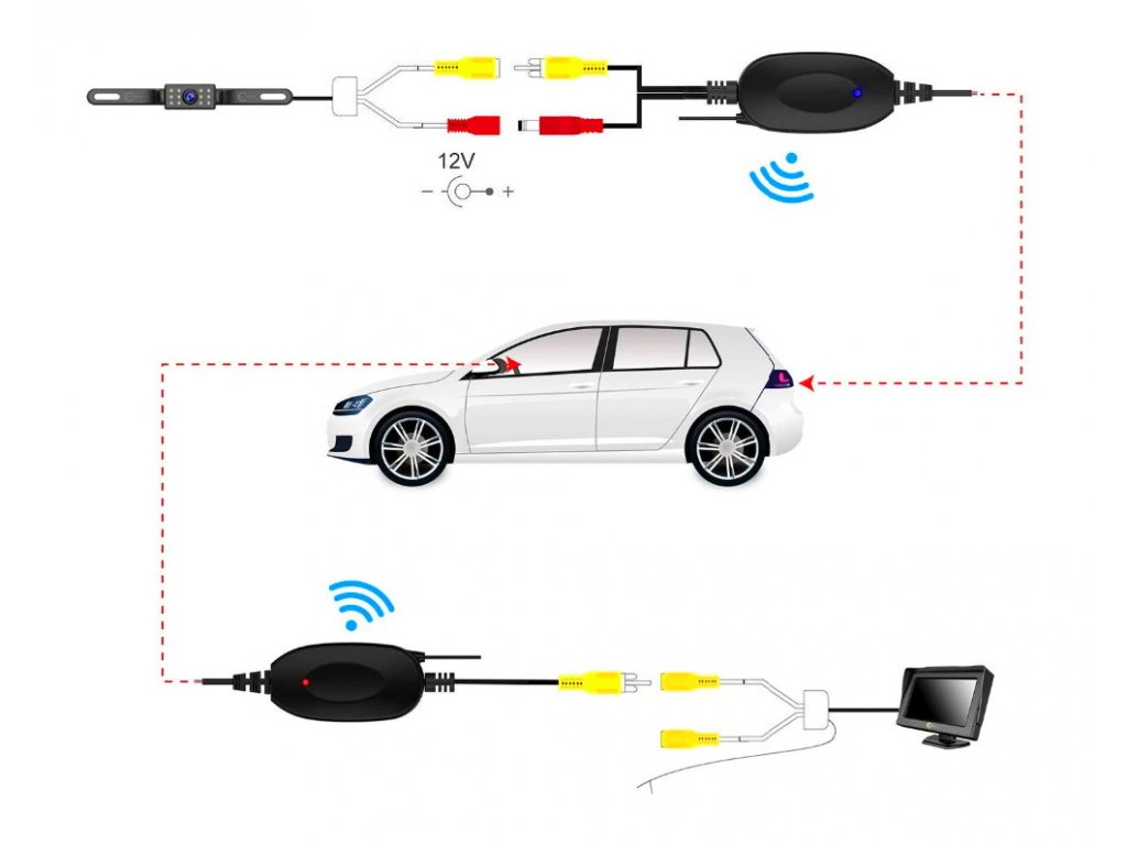 Bezdrôtový vysielač a prijímač je veľmi užitočné zariadenie, ktoré umožňuje bezdrôtový prenos signálu z kamery na monitor alebo obrazovku v aute. Zariadenie pracuje s elektrickou inštaláciou automobilu o napätí 12Va ty nemusíš ťahať prepojovacie káble cez celé vozidlo.