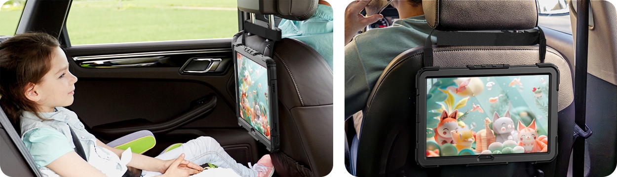 Vďaka popruhu na opierku hlavy je tablet bezpečne pripevnený a tvoje dieťa môže pokojne sledovať svoje obľúbené rozprávky v aute. Pohodlná cesta bez potreby držania zariadenia v rukách!
