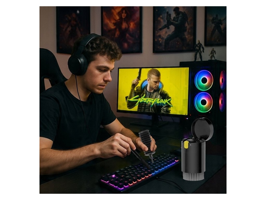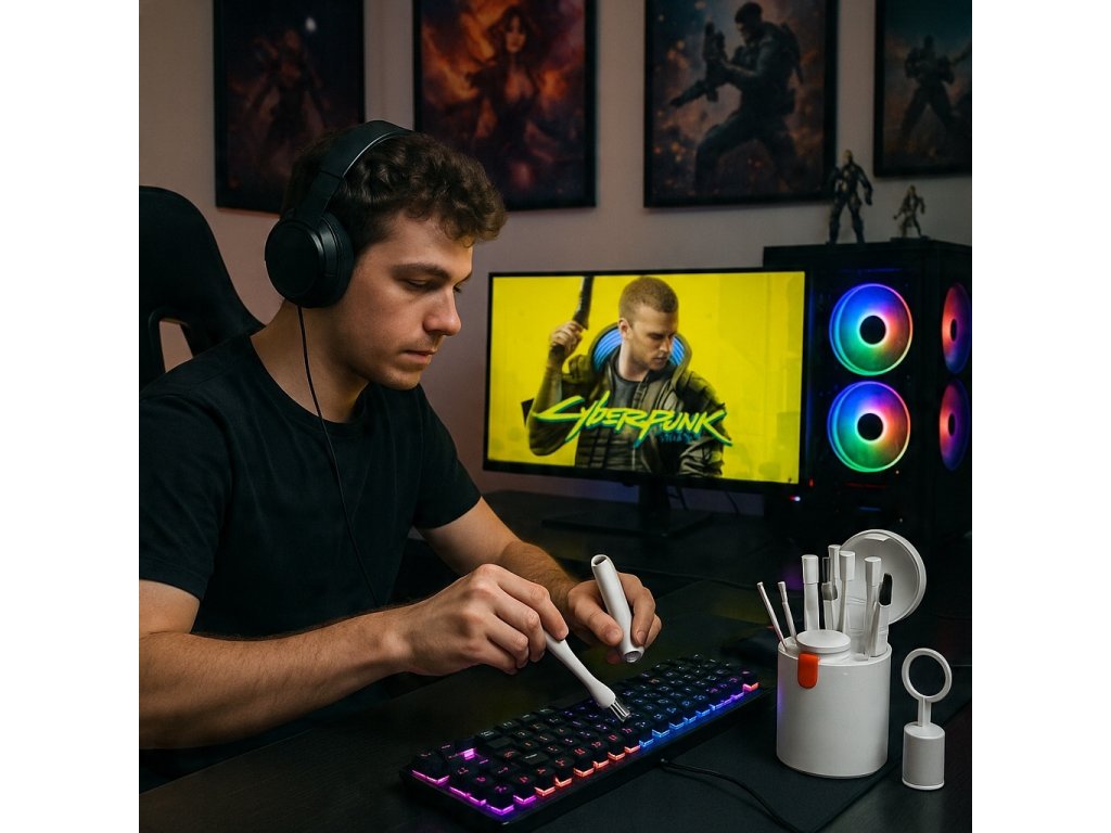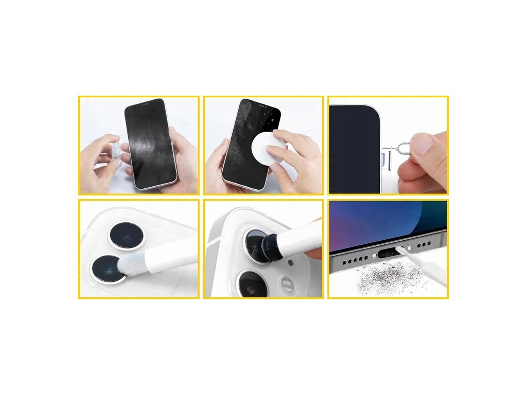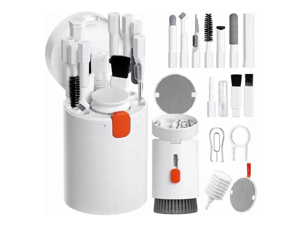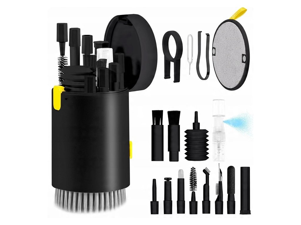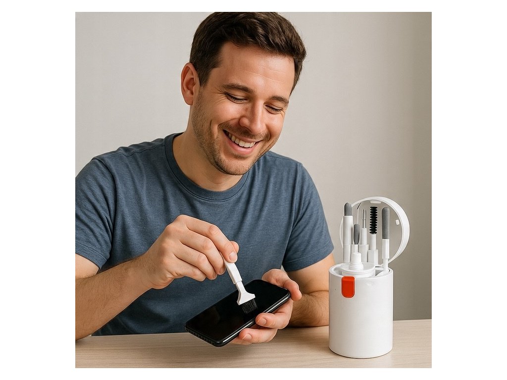 Čisticí sada pro smartphony, fotoaparáty, objektivy, tablety, laptopy, klávesnice, reproduktory, obrazovky a další zařízení s těžko přístupnými zákoutími.