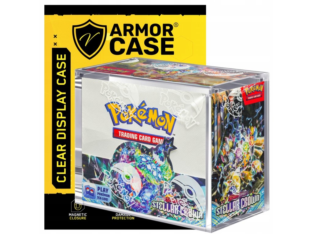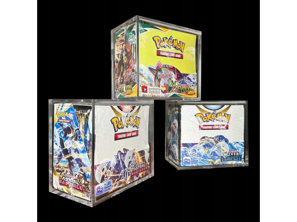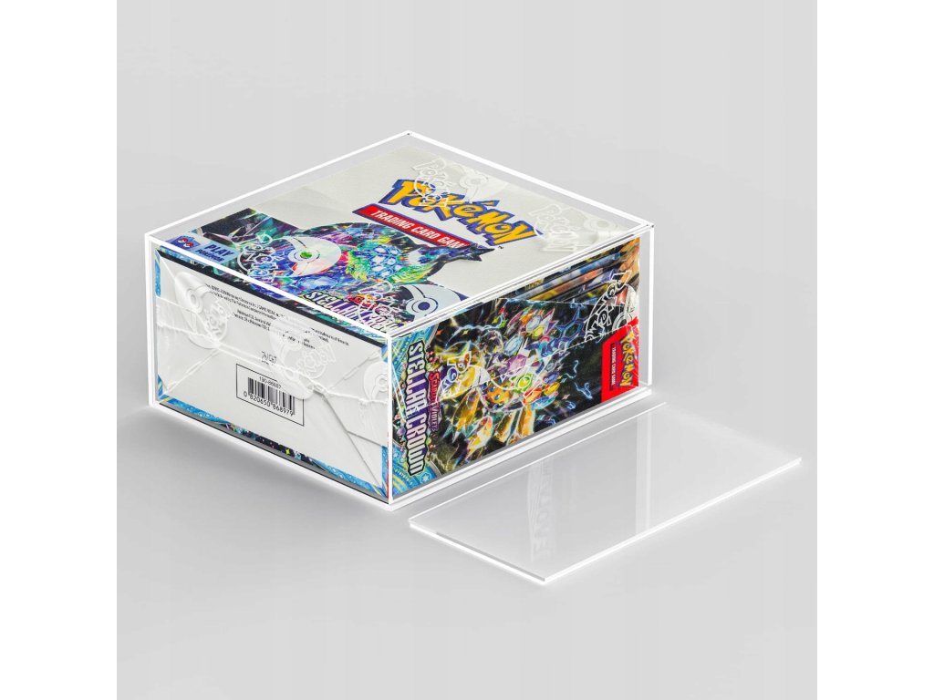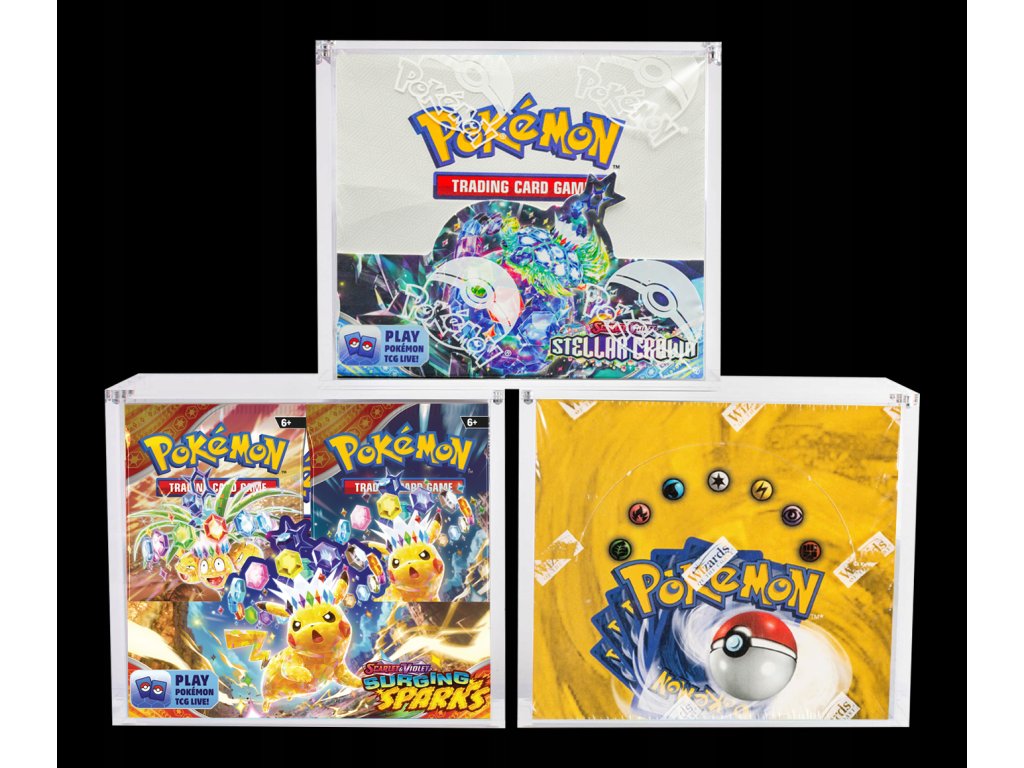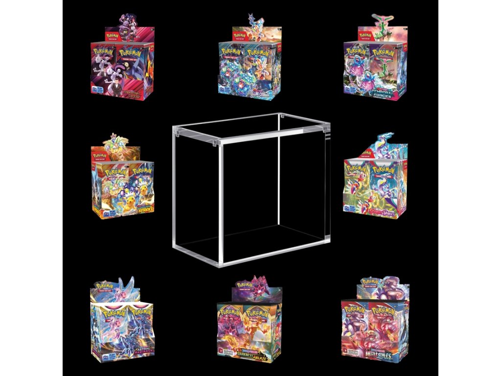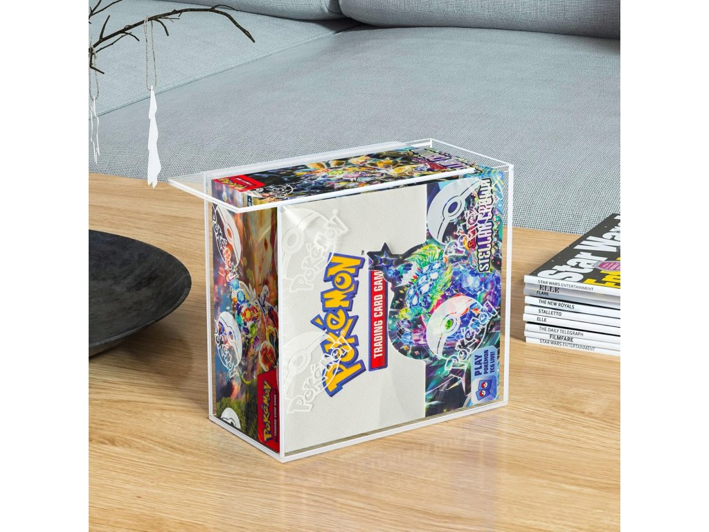 Exkluzivní průhledná akrylová vitrína navržená speciálně pro anglické sady Pokémon TCG Booster Box.