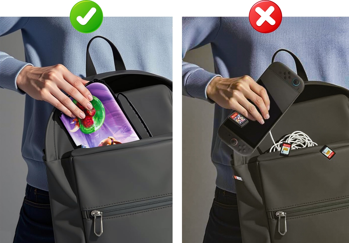 Vďaka precíznemu prispôsobeniu a vysokokvalitným materiálom puzdro dokonale prilieha ku konzole a neobmedzuje prístup k portom ani tlačidlám. Mäkká vnútorná výstelka chráni displej aj Joy-Cony a praktické priehradky ti umožnia vziať si so sebou obľúbené hry – ideálne riešenie na každú misiu, doma aj na cestách.